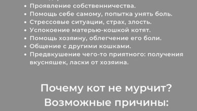 Узнайте, почему кошки начинают мурлыкать, какие причины этому могут быть и что это означает для вашей любимицы. Разберем 7 самых распространенных причин, от ласки до заключения примирительного договора.