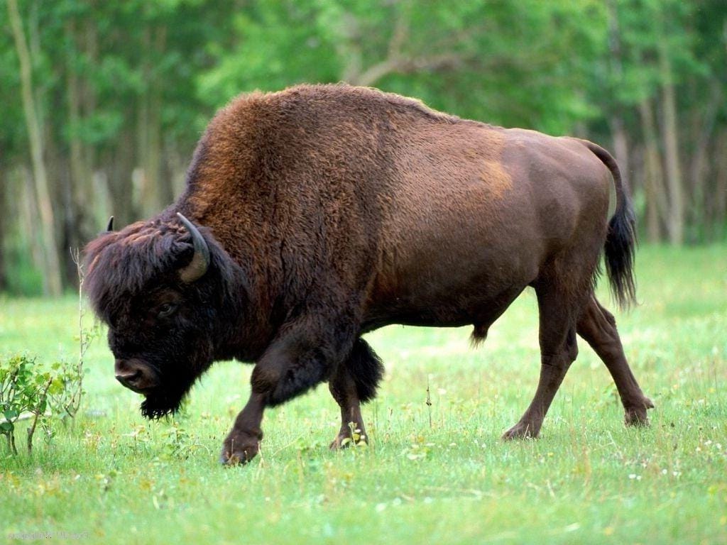 Цвет шерсти в основном коричневый или темно-серый. Бизон питается мхом, травой, ветками, сочной зеленой листвой.