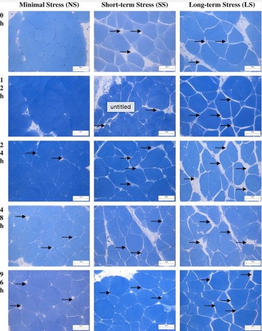 Стресс перед или во время убоя, от тесноты в сетях или от открытого воздуха, а также длительный стресс от содержания в неправильной аквасистеме влечет за собой фактический износ тканей. В следствие распада глюкозы в мышцах образуется молочная кислота(и падает уровень кислотности). Это в свою очередь влечет за собой увеличение числа мышечных ферментов, которые разрушают белки. Одно исследование даже утверждает, что стресс повышает количество этих ферментов, делая их более эффективными. Также стресс ведет к появлению в крови большего числа «стрессовых соединений», которые также ведут к разрушению структуры мышц.