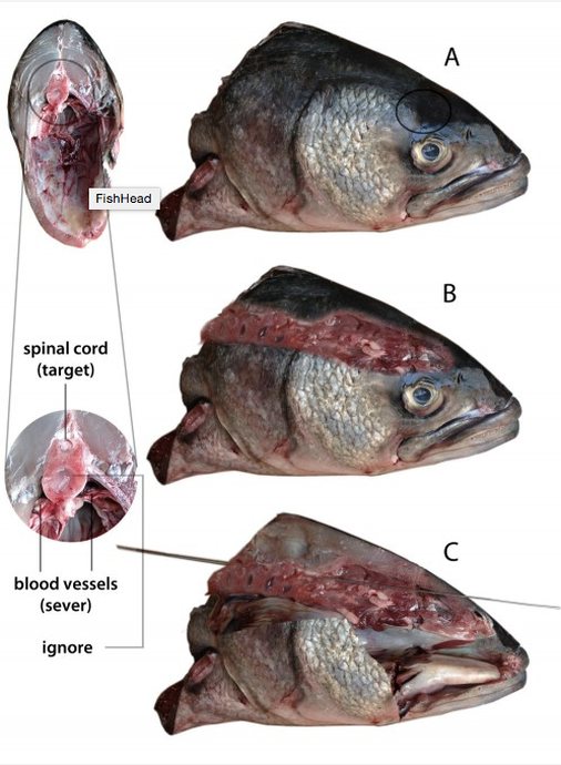 Для умерщвления больших рыб, таких как тунец, принято вставлять иглу через голову в спинной мозг(Метод Танигучи). Вы делаете небольшую дырку между глаз и вставляете проволоку в позвоночник. Если рыбак убивает рыбу, используя этот метод, он оставляет проволоку, чтобы показать, что тунец убит правильно. Теоретически, полость мозга образует воронку, которая сама направляет иглу в позвоночнике. Я пробовал этот метод на голове голубого тунца, но он не увенчался успехом. Игла выходила через мышцы.
