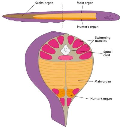 Большая часть тела электрического угря состоит из электрических органов. Главный орган и орган Хантера отвечают за выработку и накопление электрического заряда. Орган Сакса вырабатывает электрическое поле низкого напряжения, которое используется для электролокации.