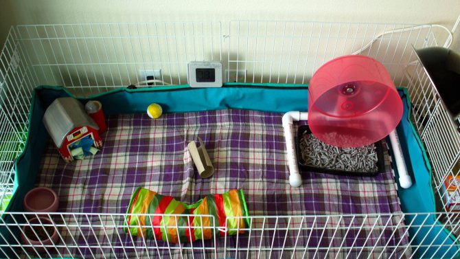 Комфортная температура для грызунов примерно +22…+26 °C. Летом вольер размещают на балконе или лоджии, но солнце не должно попадать прямо на него. Иногда можно давать возможность животному побегать по квартире, но без присмотра его оставлять нельзя, так как он может запутаться в проводах или перегрызть их, а также повредить комнатные цветы, мебель, напольное покрытие и пр.