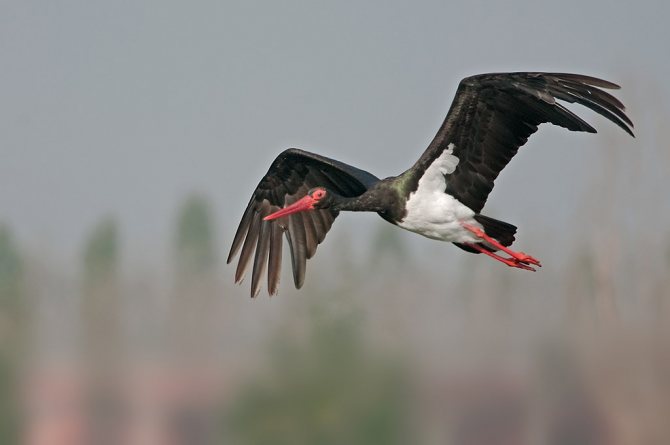 В полете черный аист вытягивает шею вперед, а ноги – назад. А еще он, как и другие виды аистов, часто свободно парит в воздухе, широко раскинув крылья. Пожалуй, единственная возможность увидеть черного аиста в природе – это когда он парит над гнездом.