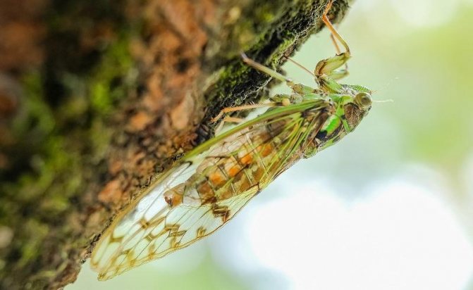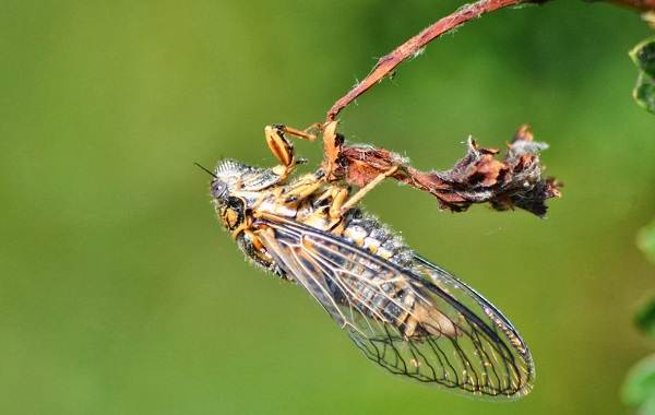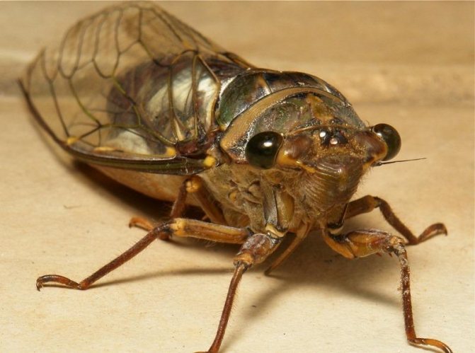 Как выглядит цикада? По внешнему виду она больше всего напоминает ночную бабочку с прозрачными перепончатыми крыльями (как видно на фотографии), из которых одна пара длиннее другой. Голова у взрослой цикады короткая, глаза фасеточные, выпуклые.