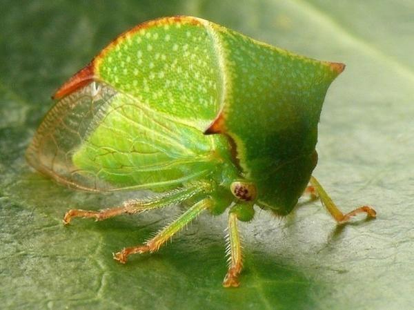 Как распознать? Это миниатюрное насекомое зеленого цвета и длинной тельца до 1 сантиметра у самок и 7-8 миллиметров у самцов. Над головой у него расположен своеобразный нарост, из-за которого цикадка получила свое название. В случае опасности горбатка может улететь от преследователя.