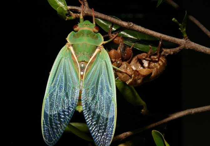 После своего превращения в цикаду (обычно это май месяц), молодое насекомое ещё не способно летать. Поэтому новорожденная цикада взбирается на какое-нибудь растение и ждёт, пока с неё спадёт старый покров.