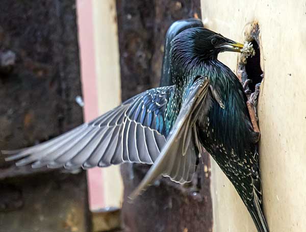Обыкновенный скворец выносит в клюве помет птенцов