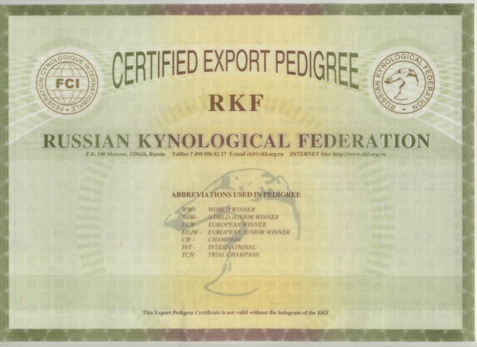Этот документ понадобится при поездках за границу для участия в выставках, вязки животного или продажи. Он содержит такие же сведения, что и российская родословная, но заполняется буквами латинского алфавита и называется CERTIFIED EXPORT PEDIGREE RKF.