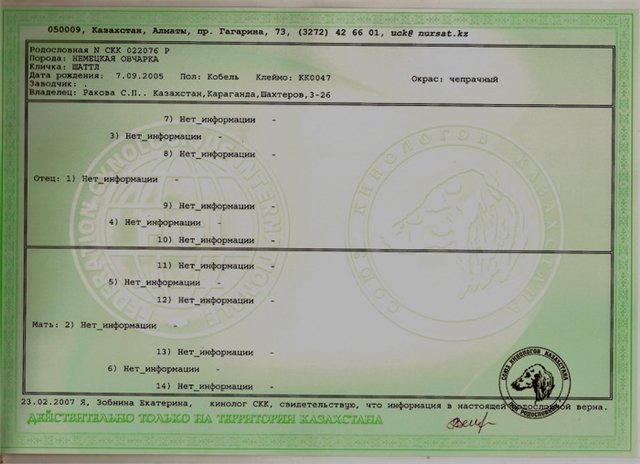 Существуют родословные, которые называются купированными. Такой документ выдается в том случае, когда в клубе произошла потеря сведений о происхождении одного из родителей, и нет возможности восстановить родословную. Тогда в графе, где указаны известные сведения перечисляются все предки, а в другой- проставляется запись «Нет информации».