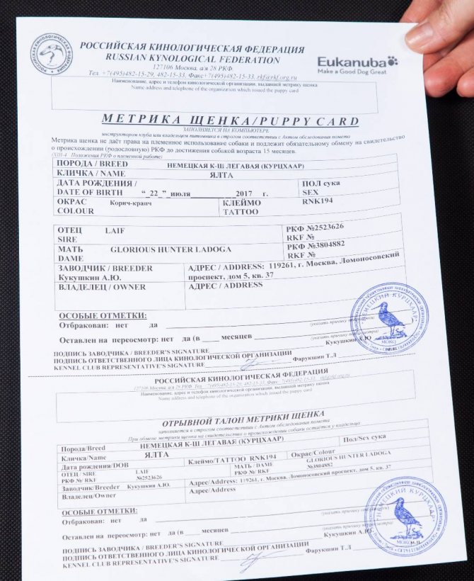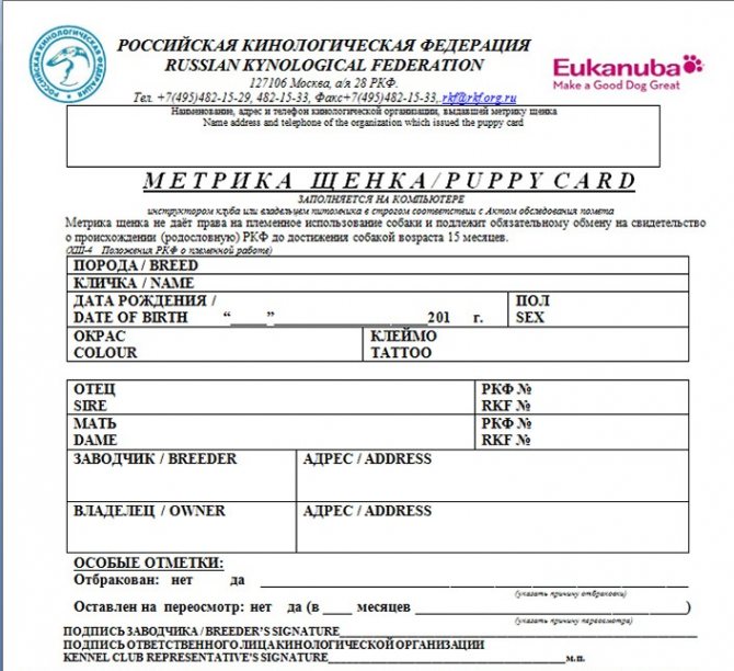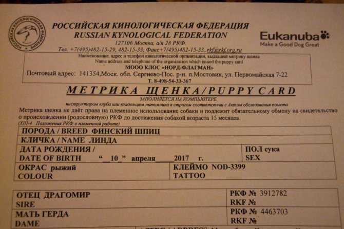 Это основной документ, который полагается щенку при покупке. В метрике собаки указывается подробная информация: