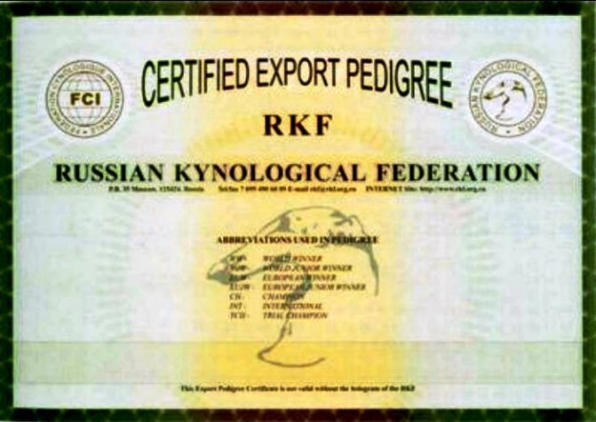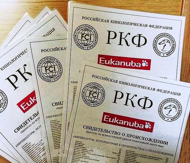Официальный документ, подтверждающий собачий род, признаваемый в России, могут выдавать Российская кинологическая федерация (РКФ или RKF) и Союз Кинологических Организаций России (СКОР).