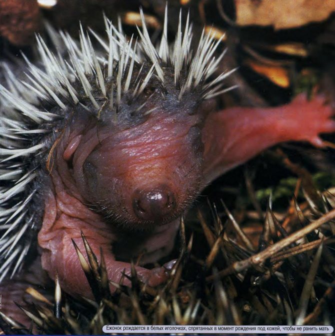 Ежонок рождается в белых иголочках, спрятанных в момент рождения под кожей, чтобы не ранить мать