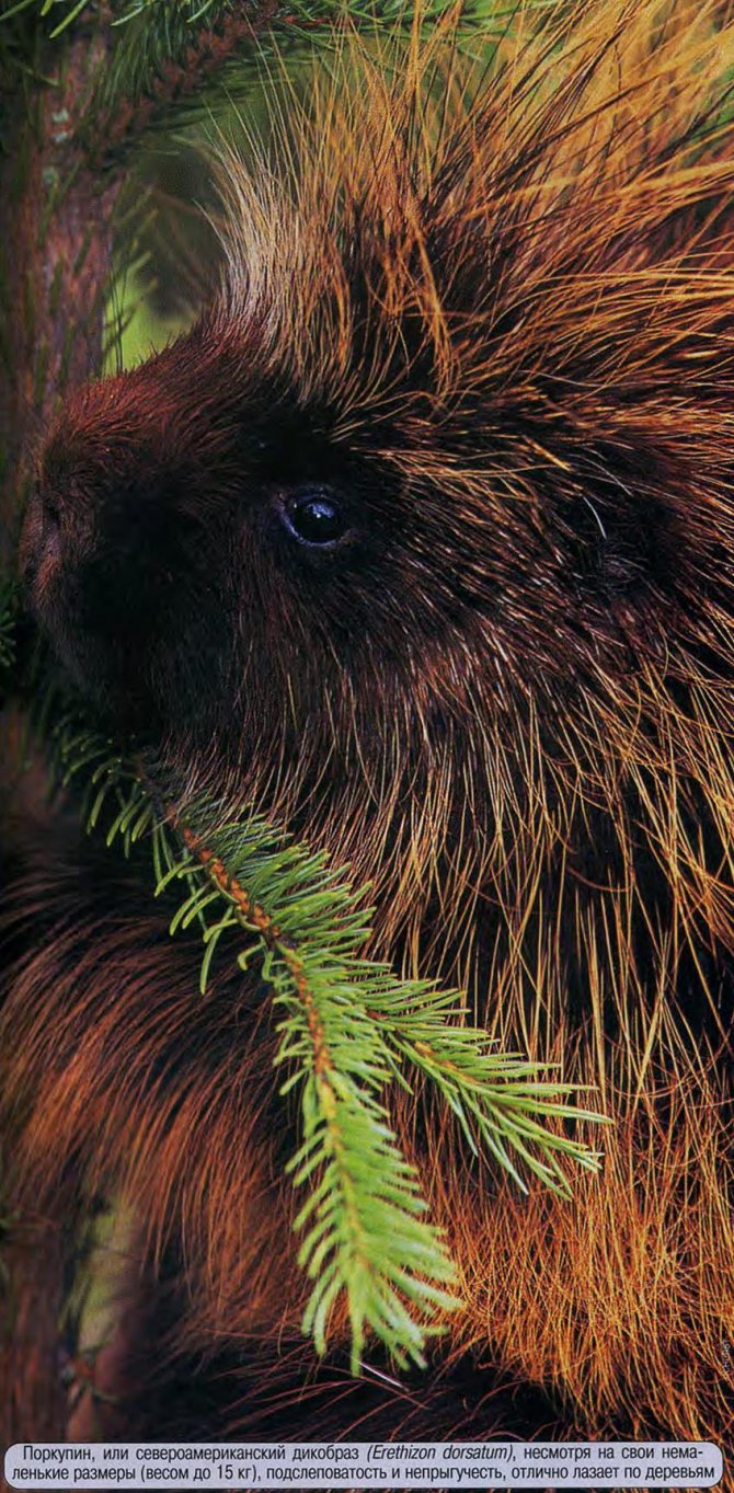 Поркупин, или североамериканский дикобраз (Erethizon dorsatum), несмотря на свои немаленькие размеры (весом до 15 кг), подслеповатость и непрыгучесть, отлично лазает по деревьям
