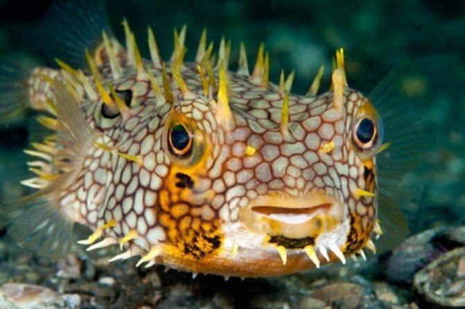Рыба-еж. Обитает в тропических морях у коралловых рифов. Отдельные экземпляры даже в обычном состоянии довольно большие, вырастают до 90 см, а все тело покрыто колючками. При малейшей опасности рыба заглатывает воду и воздух, превращаясь в большой колючий и довольно опасный шар. Рыба-еж не менее ядовита, чем знаменитая рыба-фугу.