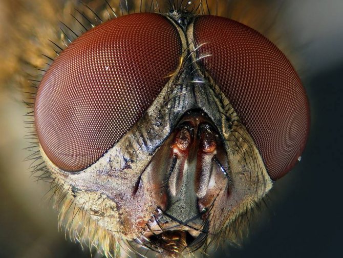 Глаза мухи, как хорошо видно, разбиты на равные секции. У некоторых видов этого насекомого на них тоже есть специальные ворсинки. При помощи такого органа муха видит всё.