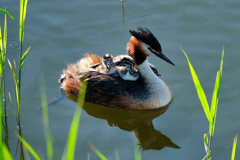 Поганки – яркие птицы с длинным острым клювом и изящным телом. Шейка, грудка и брюшко у них белые, спинка – бурая, а бока – рыжие. Поганкам тяжело передвигаться по суше из-за строения ног, которые сильно отнесены назад, однако, такая особенность делает их прекрасными пловцами.
