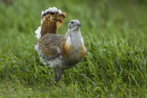 Считается уязвимым видом. Обладает крупными размерами, вырастая чуть более метра в длину при весе около 10-15 кг. Размах крыльев достигает 260 см. Окрас оперения сочетает рыжие, белые, серые и чёрные оттенки. Ноги при этом лишены перьев. Несмотря на то, что дрофа отлично летает, она предпочитает ходить по земле.