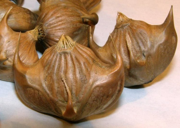 Водяной орех за необычную форму называют также чертовым – выросты на зрелых плодах напоминают рога. Однолетнее растение относится к реликтовым видам, существовавшим еще в доисторические времена. Чилим использовали в пищу: по составу орехи не уступают злаковым культурам.