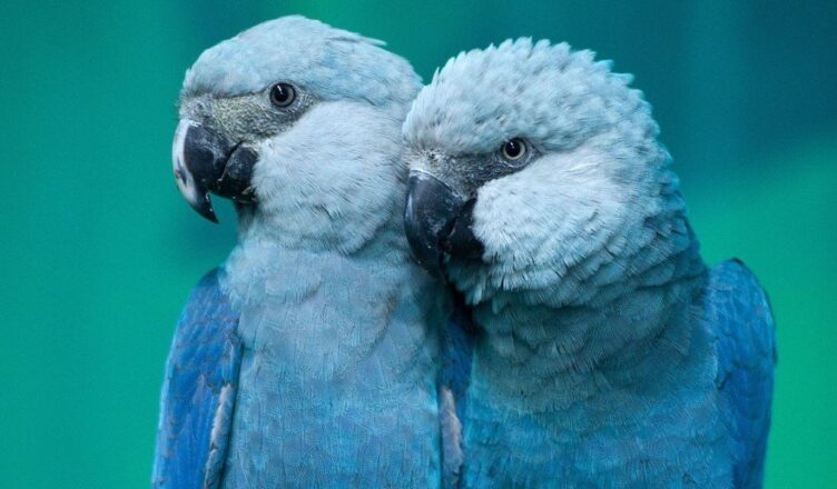 9. Фото голубых ар, где видно цветовую гамму перьев и детали их строения.