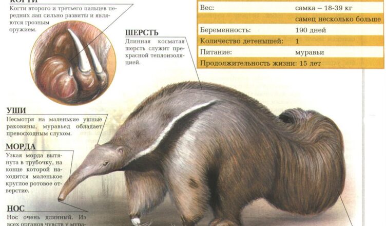 Как выглядят муравьеды? Они обычно имеют сильные передние лапы и длинный густой мех, который защищает их от жаления насекомых. Многие виды муравьедов имеют длинный изогнутый язык, который используется для вылавливания муравьев и термитов из их гнезд.